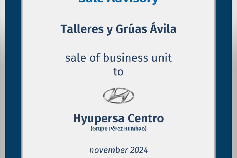 Finae Partners advised Talleres y Grúas Ávila, S.L. in the sale of its Hyundai operations in Valladolid, to Hyupersa Centro, S.L. (belonging to Grupo Pérez Rumbao)