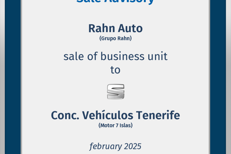 Finae Partners advised Rahn Auto Universal, S.A. and GR Vehículos Canarias, S.A., companies belonging to Grupo Rahn, in the sale of their Seat operations in Tenerife, to Concesionario Vehículos Tenerife, ...