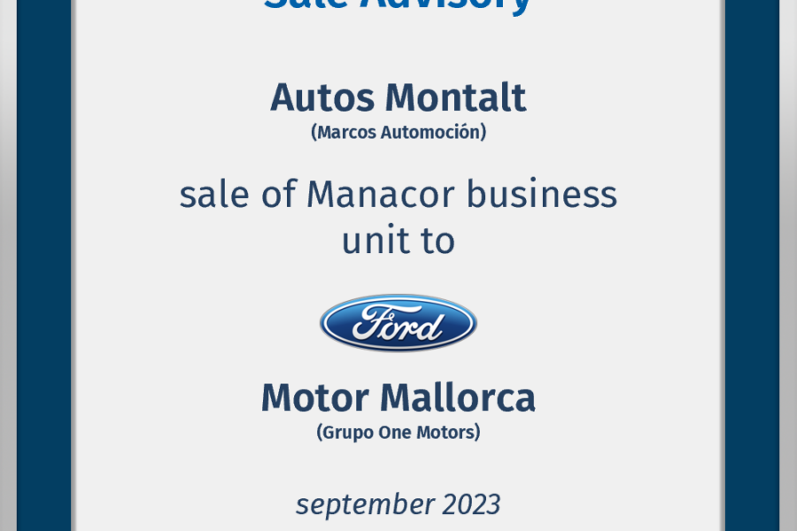 Finae Partners advised Autos Montalt, S.A. (belonging to Marcos Automoción) in the sale of its Ford operations in Manacor to Motor Mallorca, S.A. (Grupo One Motors)