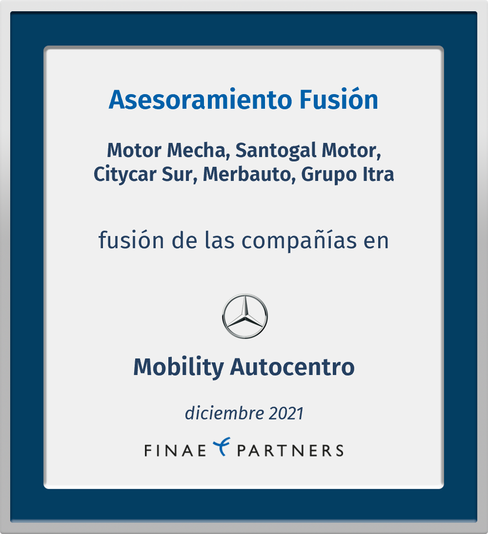 Finae Partners asesoró a los accionistas de Motor Mecha, S.A.U., Santogal Motor, S.L.U., Citycar Sur, S.A., Merbauto, S.A. (perteneciente a Grupo Bartolomé) y Grupo Itra (Industria Técnica Reparación de Automóviles, SL.U., Industrias Técnicas de Automoción y Repuestos, S.L., Itarsa Norte, S.A. e Itarsa Servicios, S.A.) en la integración de sus compañías en el grupo Mobility Autocentro